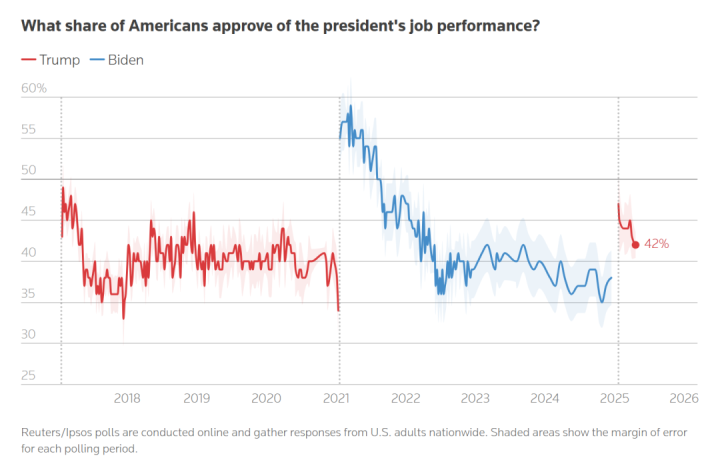 根据这项为期六天的调查,约42%的受访者认可特朗普的总统表现,低于三周前43%的调查结果,也低于1月20日特朗普就职之初的47%。